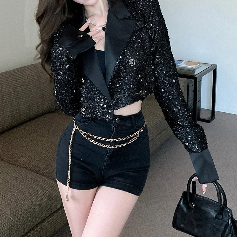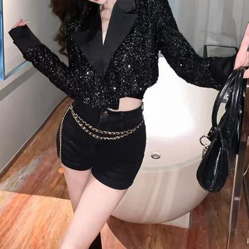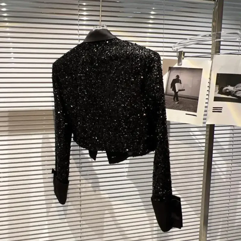 Korejská verze černého flitrovaného kardiganu s dlouhým rukávem, dámského podzimního a zimního střihu, nového módního ležérního topu.