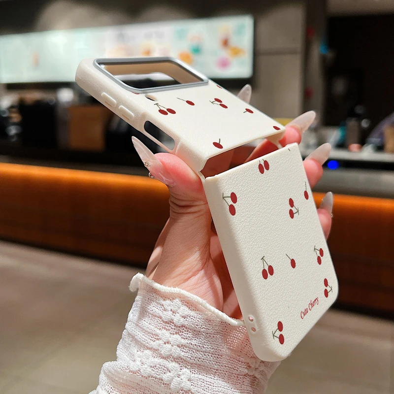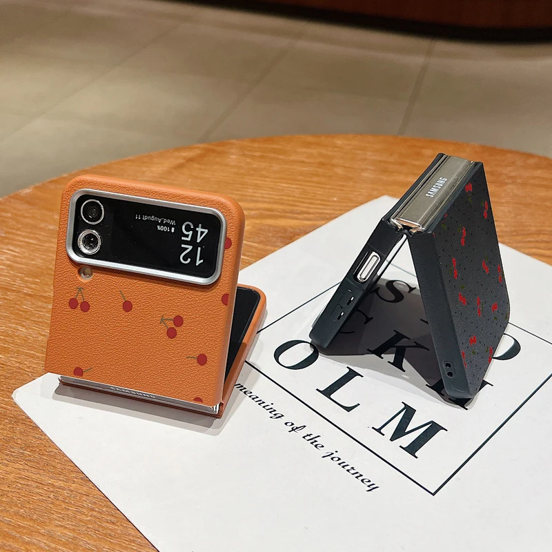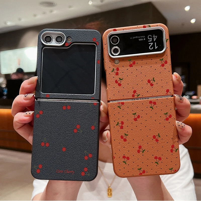 Kožené pouzdro s potiskem třešní pro Samsung Galaxy Z Flip7 Flip5 Flip6 Flip 7 FE 6 5 4 5G Skládací měkké TPU kryt na telefon