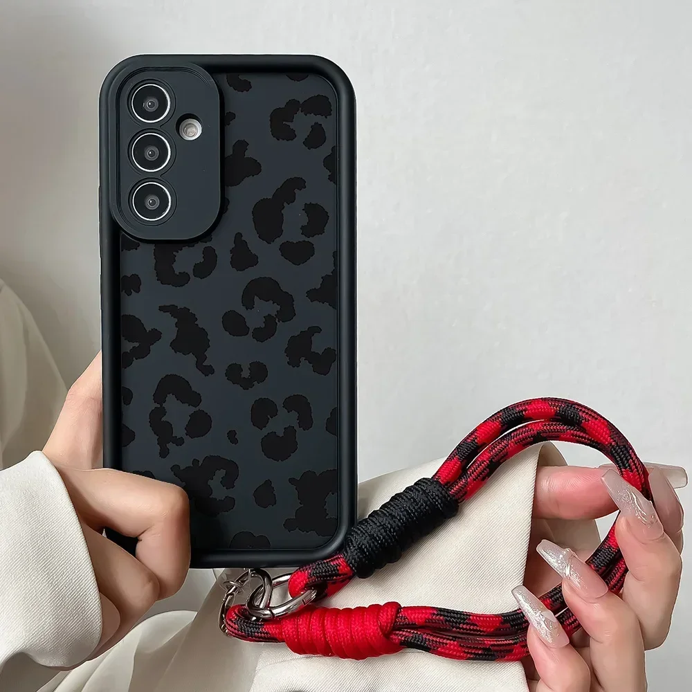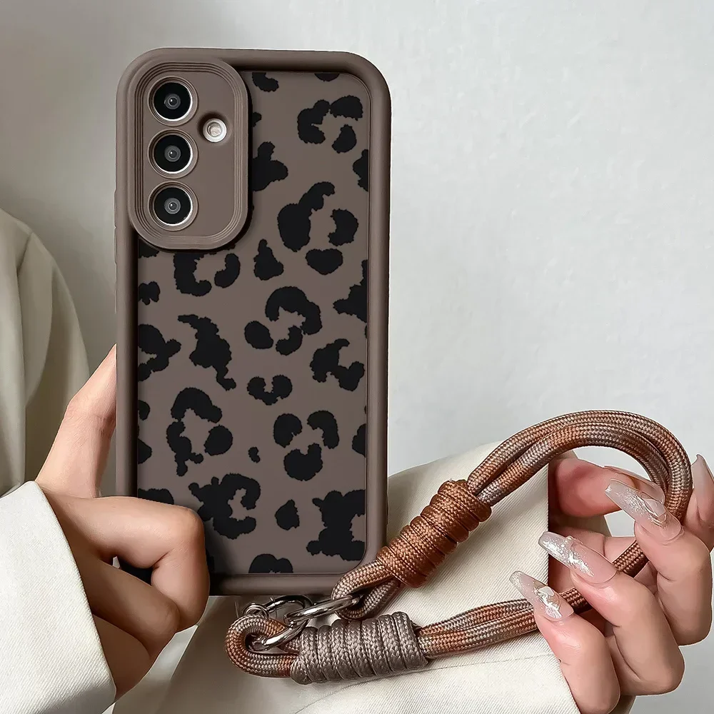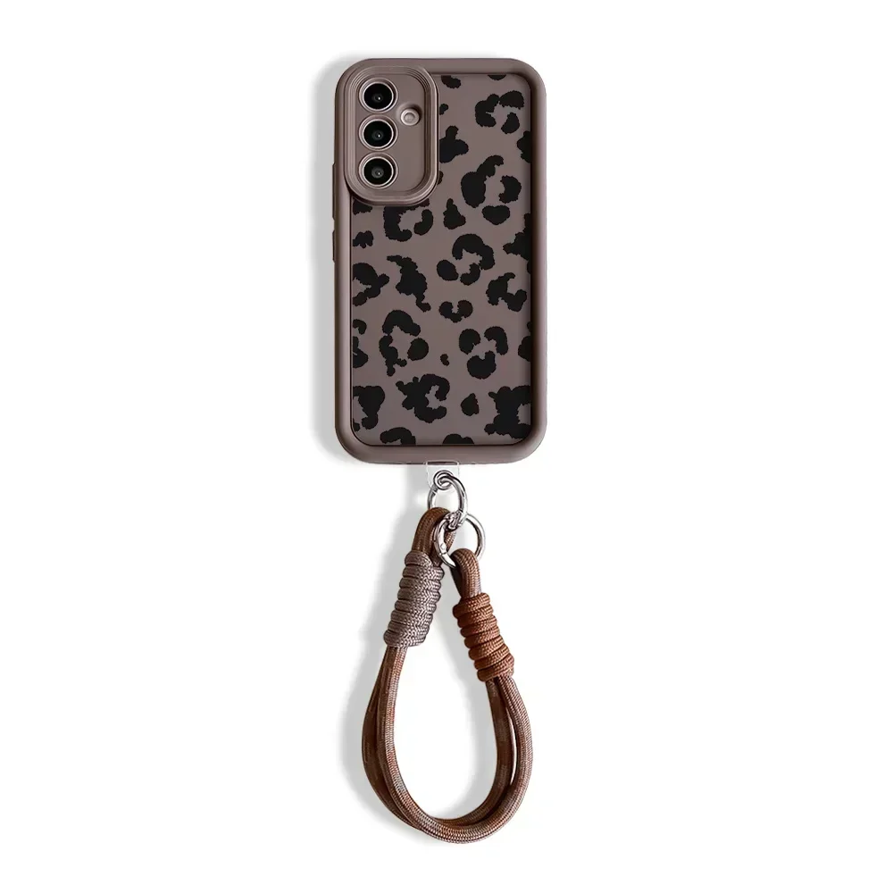 Pouzdro s leopardím vzorem a řetízkem na zápěstí pro Samsung S25 Plus Ultra S24 FE A16 A06 17 07 26 36 56 M13 M35 M55 M32 Poutko na zápěstí Kryt na telefon